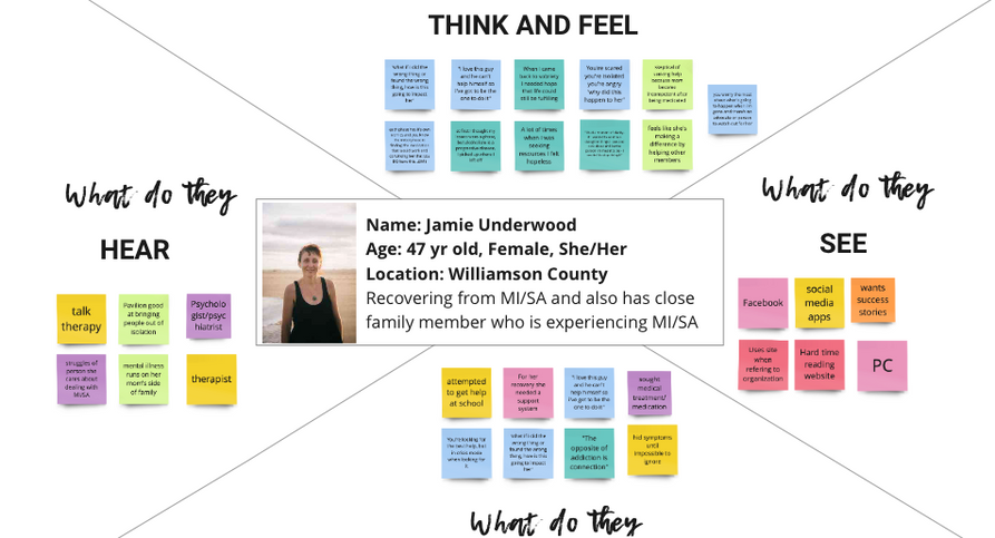 Our research lead me to help synthesize Jamie Underwood, a potential Pavilion member living in Williamson County that requires assistance and resources for her substance abuse and mental health issues.